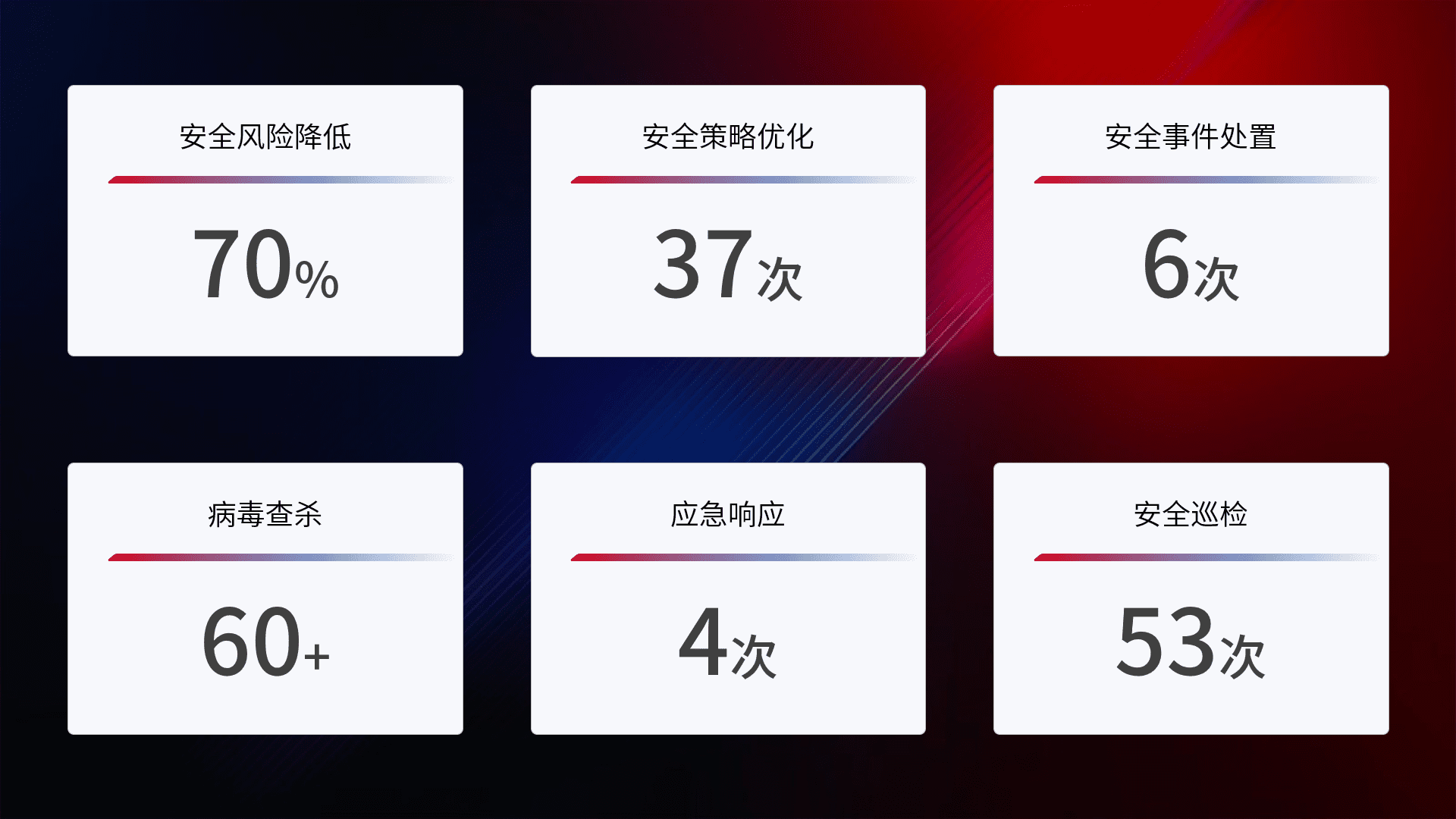 提供全面的安全事件报告体系,,,,包括处置报告、、周报、、、季度和年度总结,,,,结合持续监控,,,帮助客户深入了解网络安全状况。。。。